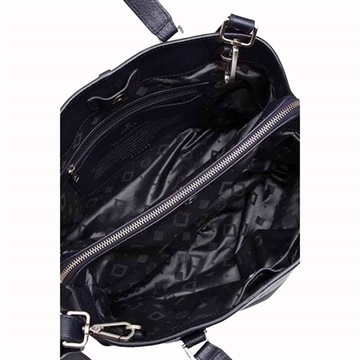 Indvendigt er tasken inddelt i tre rum. De to af rummene er åbne og det sidste lukkes med lynlås. Der er også en lynlåslomme og en åben lomme i foret.